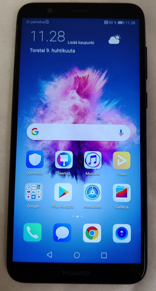 Huawei P Smart, FIG-LX1, 32GB. Näytössä on pieniä naarmuja. Takakannessa on kulumaa ja käytön jälkeä. Puhelin on hieman taipunut. Testattu ja toimiva