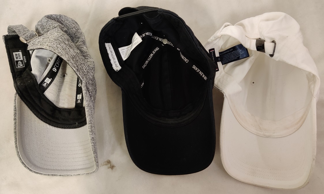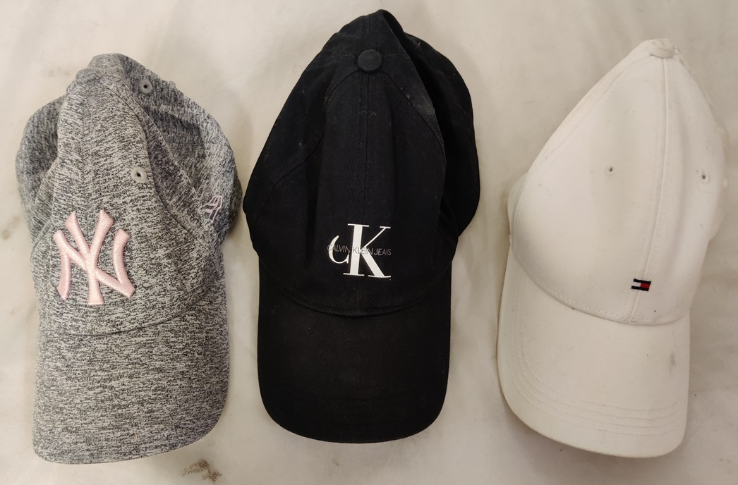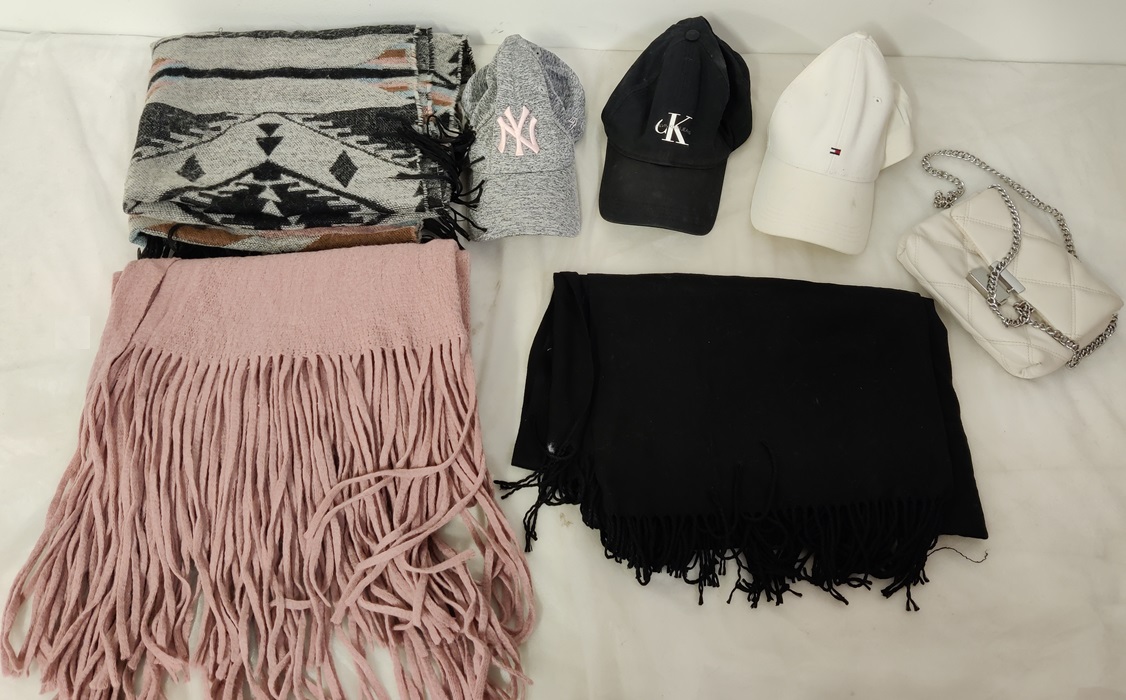 Muutama huivi, pieni käsilaukku, lippalakkeja (lippalakeista valkoinen Hilfigerin lippis tarvitsee pesun, esim. astianpesukoneessa), mukana myös Calvin klein Jeans lippis