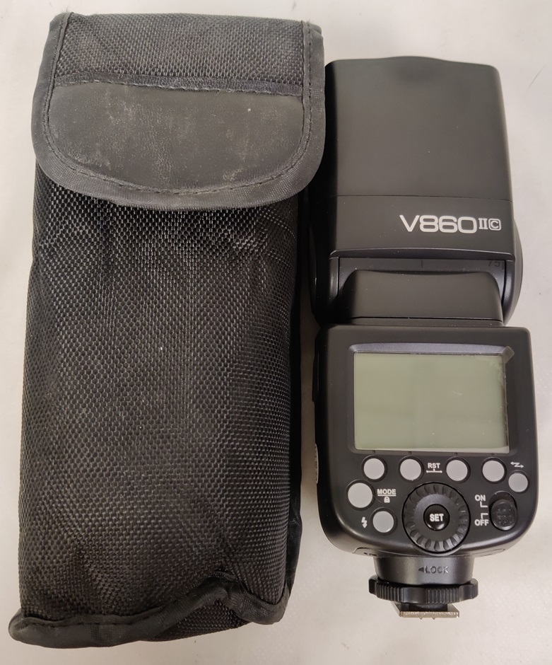 Godox V860 II Canon Salamavalo. Näytöissä on vielä uudet muovit päällä. Mukana säilytyspussi ja akku, ei akkulaturia.