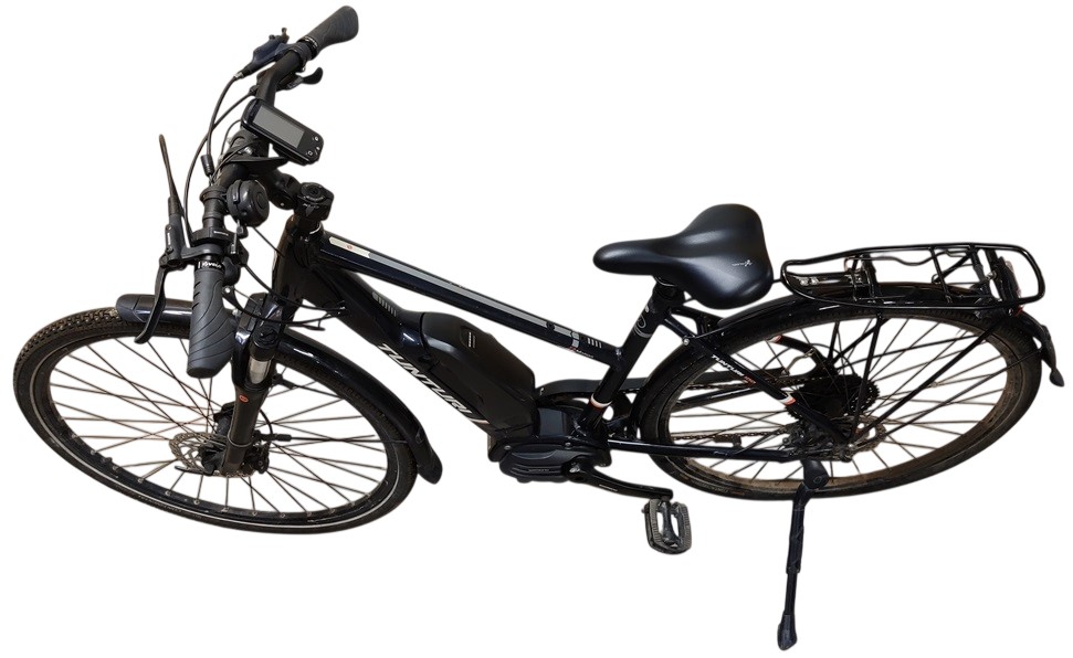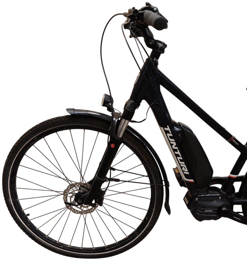 Tunturi E-motion 100 sähköpuörä, 100-vuotis juhlamalli, 19" / 48 cm, 8 vaihdetta, jarrut ok, takarengas venttiili puuttuu, ketju ruosteessa, sähköpyörämekanismia ei testattu, akku kiinni, ei laturia, ei avaimia, keväthuollot ja tarkistukset tehtävä, renkaat tarkistettava