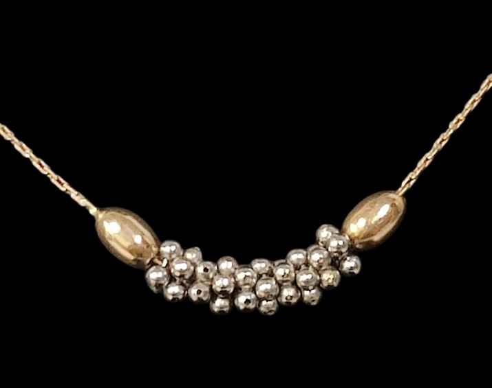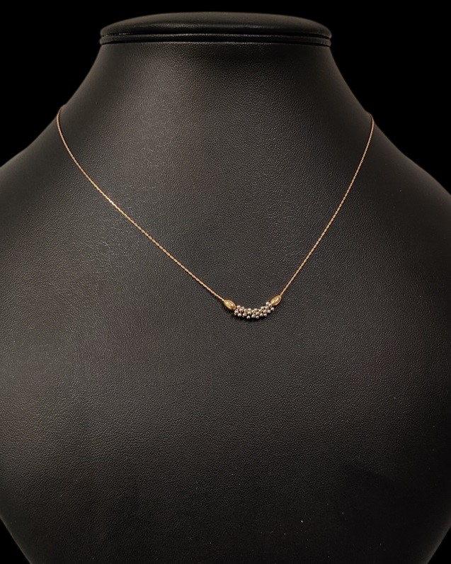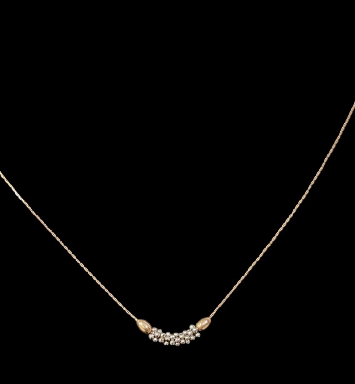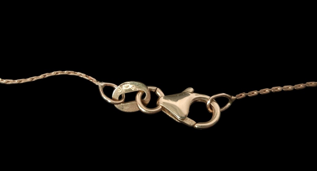 Kultainen ohut siro kaulaketju, leimat 585 ja kruunu tarkistus, korussa on kiinteä riipus, jonka metallimääre ei tiedossa, voi olla hopeaa, valkokultaa tai vaikka terästä, korun pituus n,. 43 cm, kokopaino n. 2,17, ilman riipusta arvioilta noin 1,2 gr (ketju osuus), ehjä ja käyttövalmis koru!