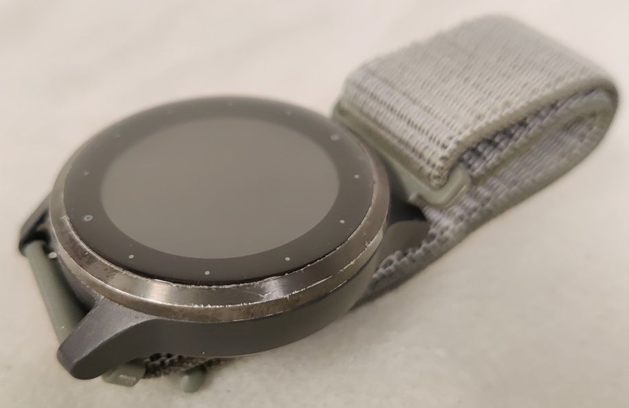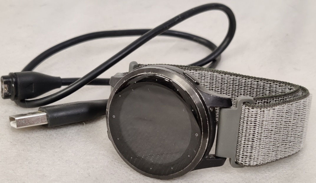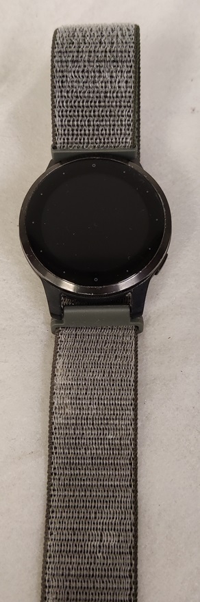 Garmin Vivoactive 4s älykello, tekstiiliranneke, pientä naarmua kellotaulun lasissa, mukana latauskaapeli, testattu ja toimiva