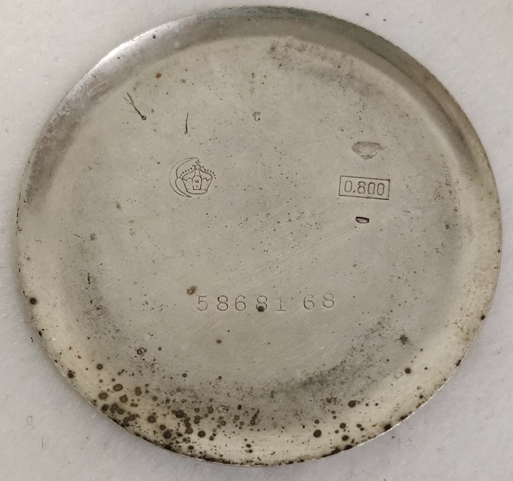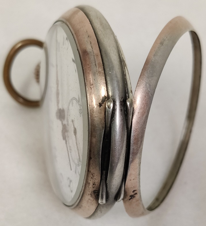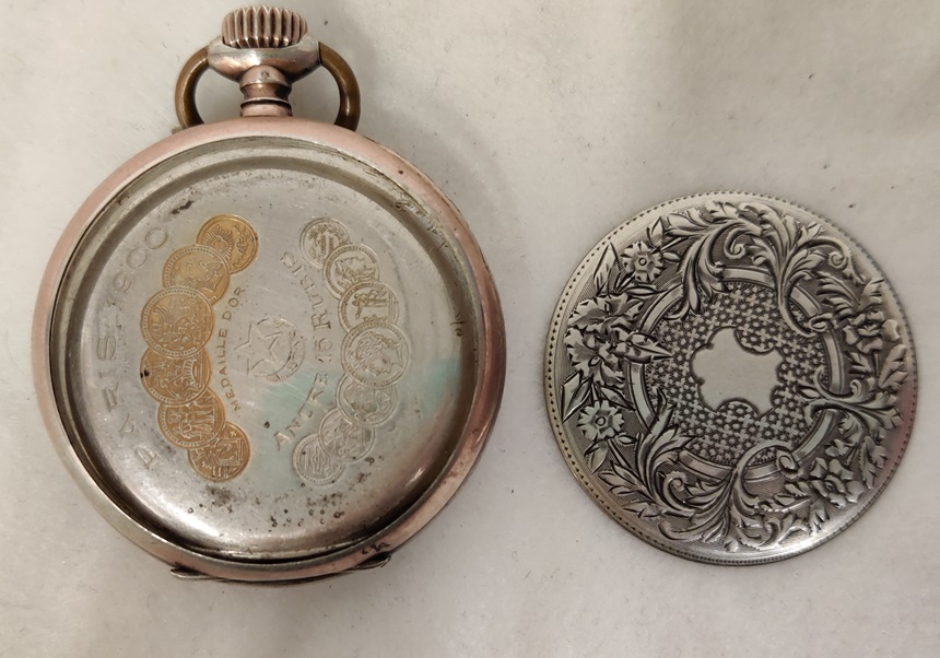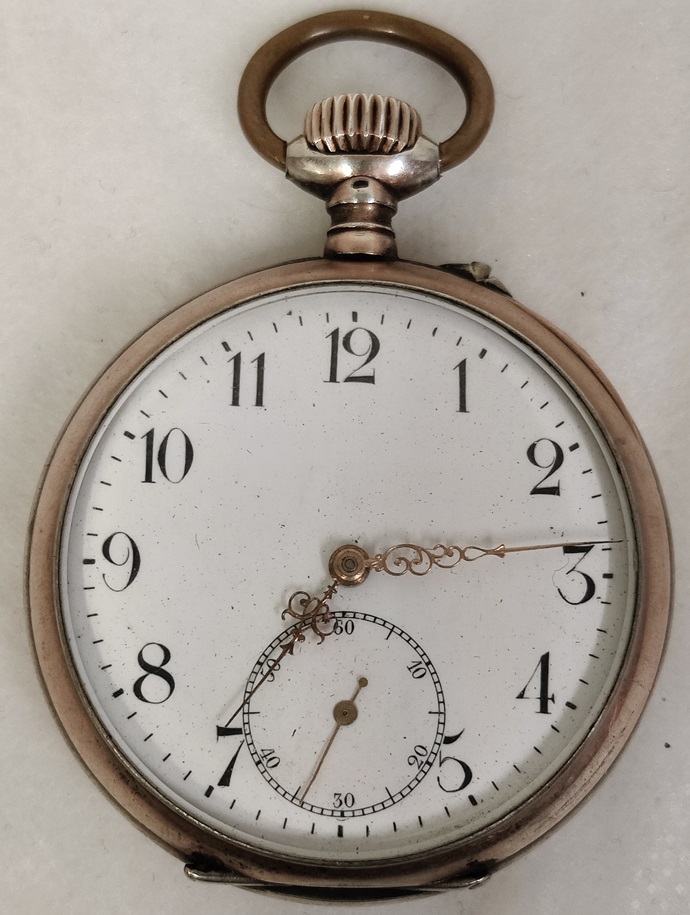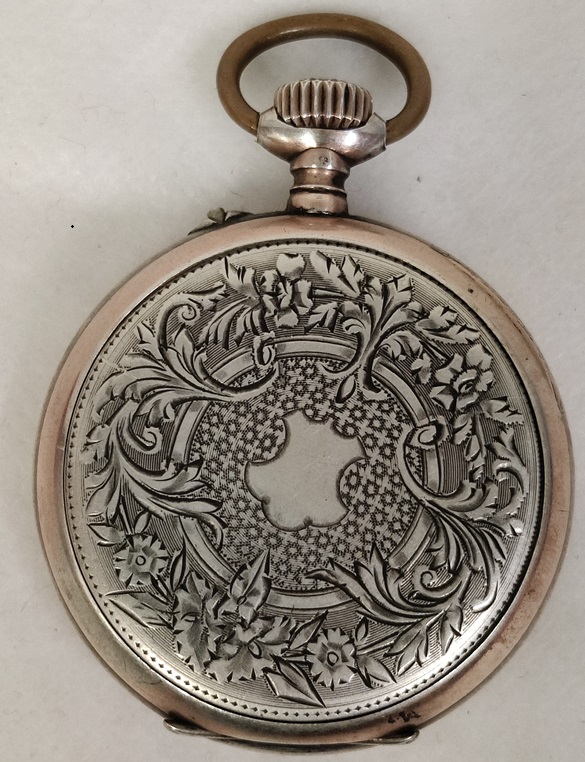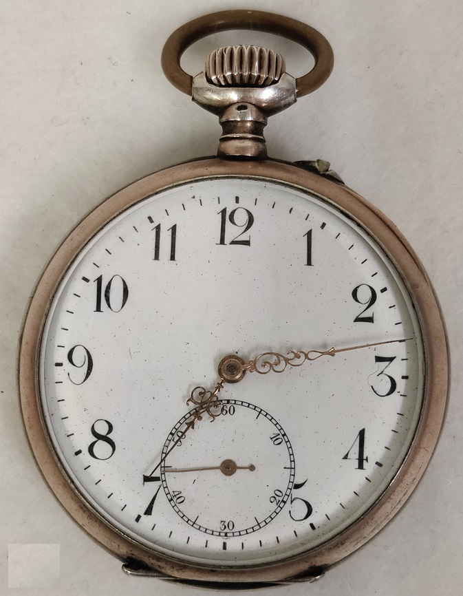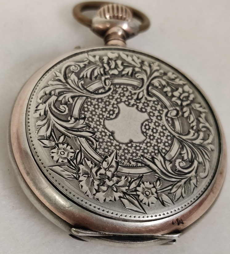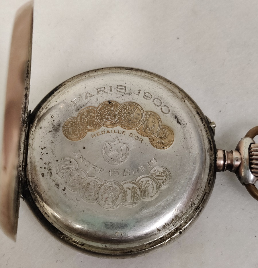 Hopeinen taskukello, kuori on hopeaa, irtonaisessa takakannessa leima 0,800, vedettävä, listaushetkellä toimii hyvin, takakansi kehyksestä irti, etukansi ei käsittelijän toimesta auennut, saranat on, Paris 1900 Ancre 15 rubis