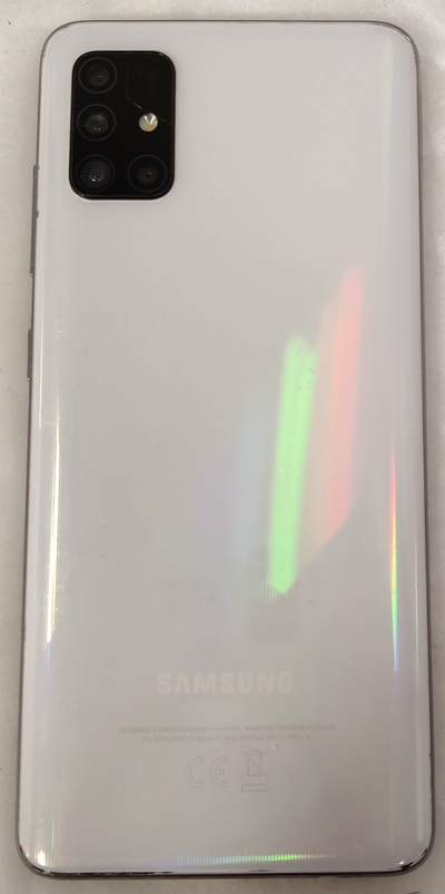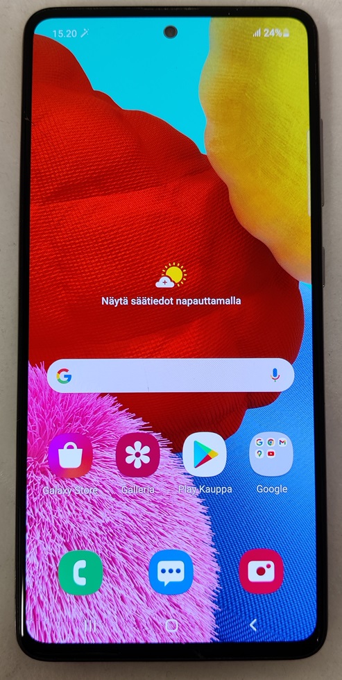 Samsung Galaxy A51, SM-A515F/DSN, 128GB. Näytössä halkeamia ja naarmuja. Takalasissa käytön jälkiä, kameran päällyslasissa halkeamia. Testattu ja toimiva