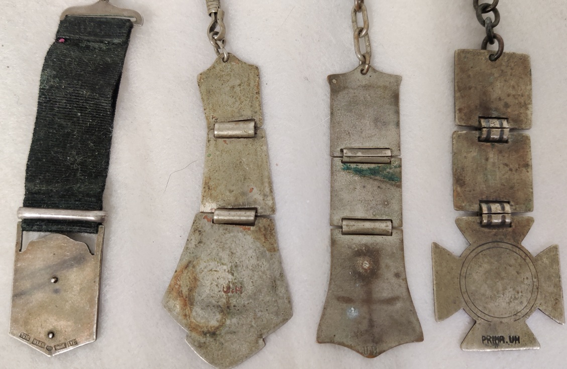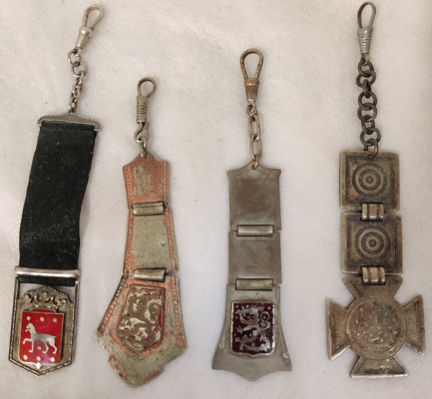 Vanhoja vaakunallisia taskukellon vitjoja, uushopeaa (3 leijonavaakunallista, kaiverrus U.H), Hämeen vaakunalla (ilves) taskukellon vitja kankaalla, hopeaa 813 (muut leimat: U6=1949, Kruunu tarkistusleima, Vene paikkakuntaleima = Helsinki, nimileima O/yK = Oy Kultala Ab)