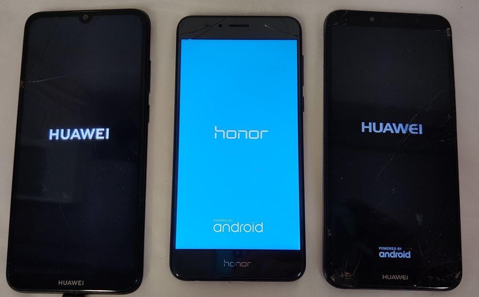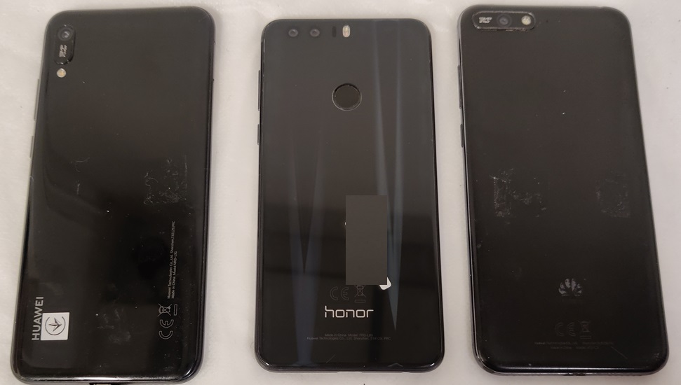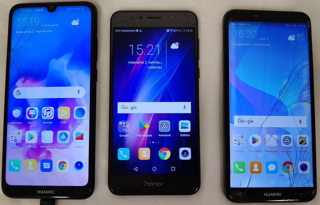 Huawei Y6 2018, ATU-L21, 16 Gt, näytö pahasti säröillä ja osia lasista puuttuu, näyttö huono, takakansi kulunut, Huawei honor 8, FRD-L09, 32 Gt, etulasissa muutama halkeama yläosassa, takalasi siisti, Huawei Y6 2019, MrD-LX1, 32 Gt, etulasissa halkeamia, takakansi kulunut, kaikki testattuja ja toimivuus vaihtelee mainituin lasivirhein