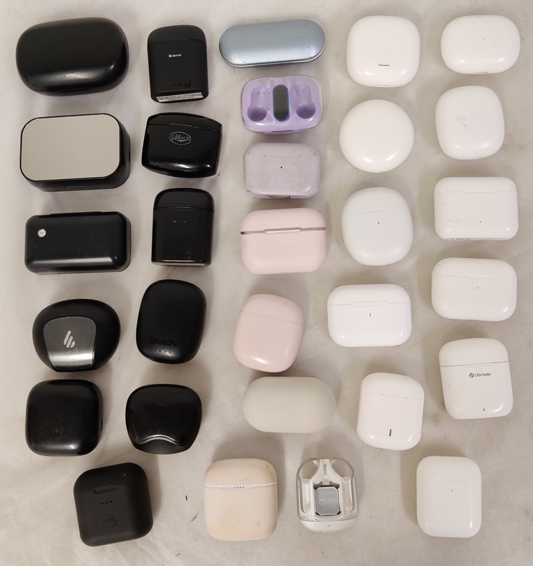 30 kpl tyhjiä testaamattomia latauskoteloita mukana mm. Exibel, Denver, Happy Plugs, Jlab, Redmi