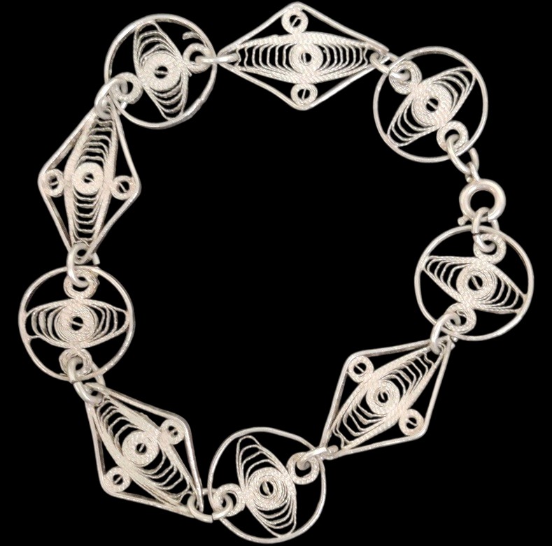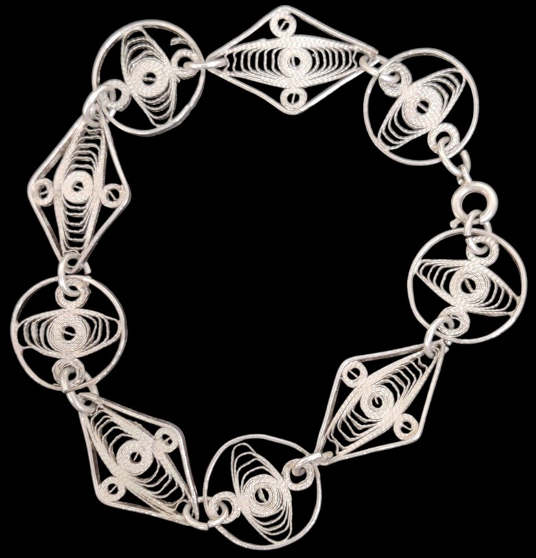 Hopeinen rannekoru "pitsinen", paloista koottu, hopeaa sterling-maininnalla, ketjun pituus n. 19 cm