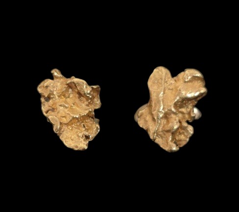 Pienet kultahippukorvakorut, tappimalli, 585, uniikit korvakorut, koska kultahiput eivät ole koskaan identtisiä, yhteispaino noin 0,70 gr