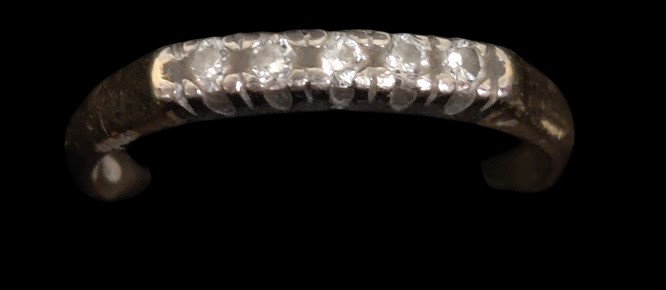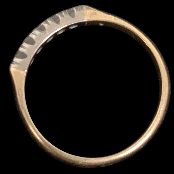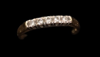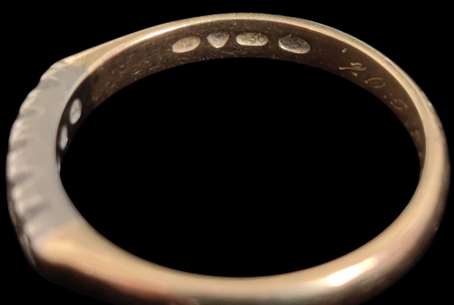 Kultainen sormus, leima 750, 5 pientä timanttia, halkaisija n. 1,7 mm = 0,02 ct, koko 17.25, paino yhtensä n. 3 gr, kaiverrus