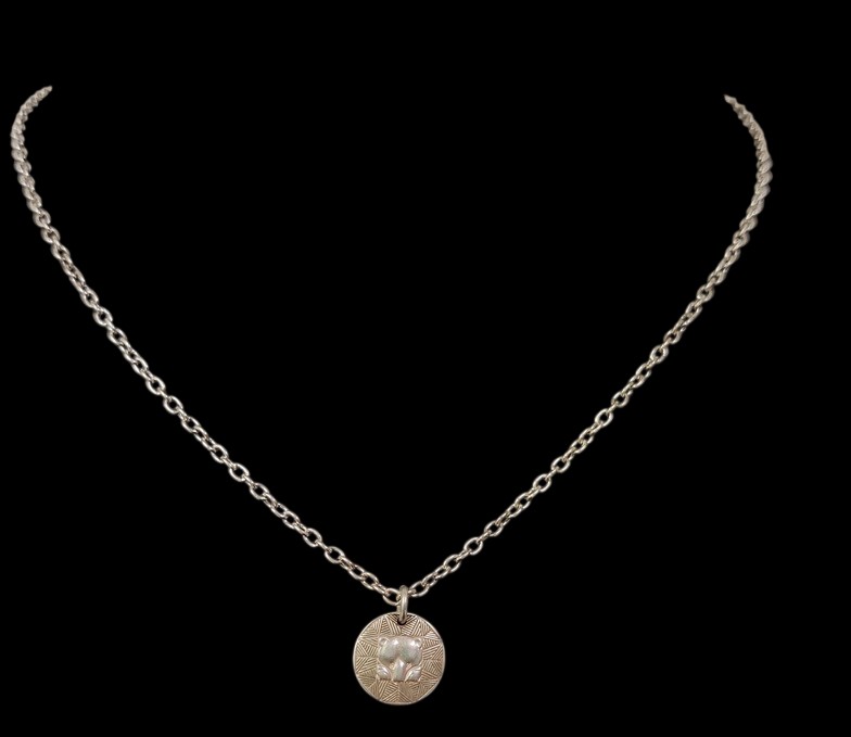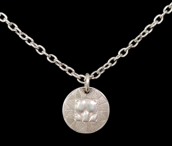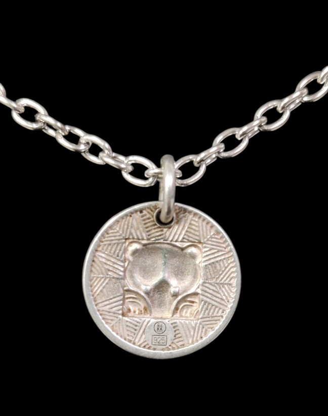 Hopeinen pieni Pohjankarhu Amuletti, riipus/hela, liitetty hopeaketjuun, ei kalevalan. Helan voi laittaa vaikka rannekoruun, helan koko n. 12,5 mm, hopeaketjun pituus säädettävä 43/46 cm