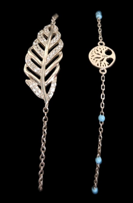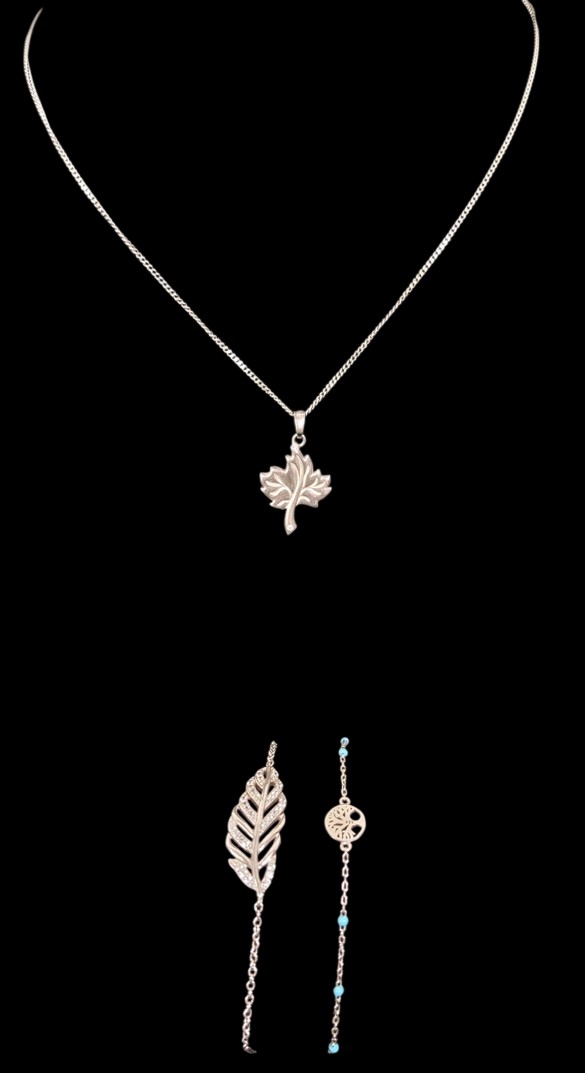 3 kpl hopeisia ketjuja, 2 ranneketjua ja yksi kaulaketju riipuksella. Kaikissa luontoaihe. Elämän puu -rannekorun pituus säädetävä 15-18 cm, kimalteleva lehtikoruinen ketju pituus säädettävä 17-19 cm, kaulaketjun pituus säädettävä n. 41-44 cm, kaikki täysin valmiita käyttökoruja, ehjiä, kaikessa hopean leima 925