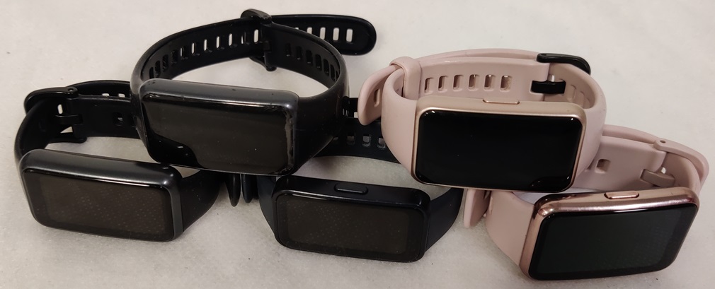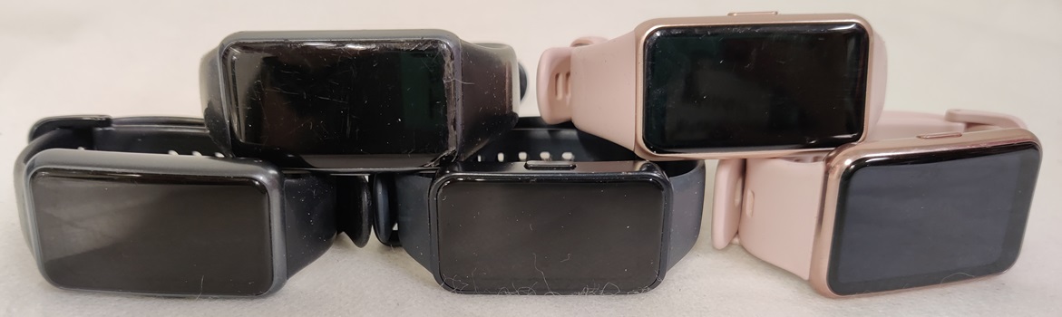 4 kpl Huawei Band aktiivisuusrannekkeita; Band 6 Fara-B19, Band 7 LEIA-B19, Band 8 ASK-B19 ja Watch FIT-1DD STIA-B09, kaikissa jonkin verran naarmuja näytössä, yhdestä puuttuu rannelenkin tukilenkki, muutoin kaikki testattuja ja toimivia, ei latureita