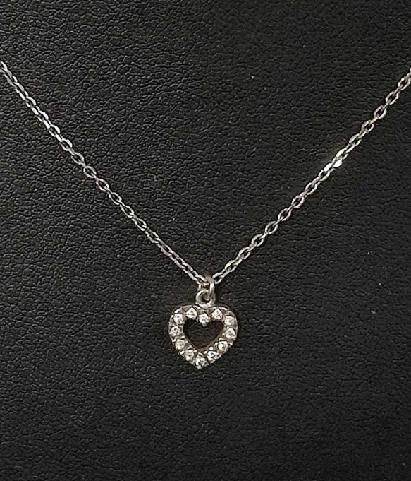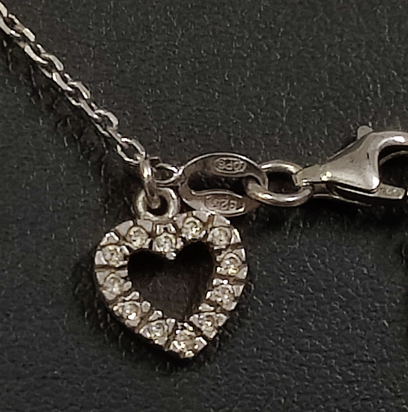 Hopeinen 925 ketju ja riipus, sydänriipus kivikoristeinen, korkeus noin 1 cm, ketjun pituus säädettävä 43-45 cm, riipus ei irrotettavissa ketjusta