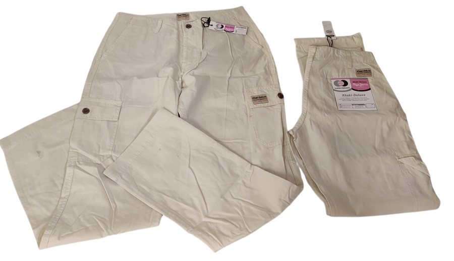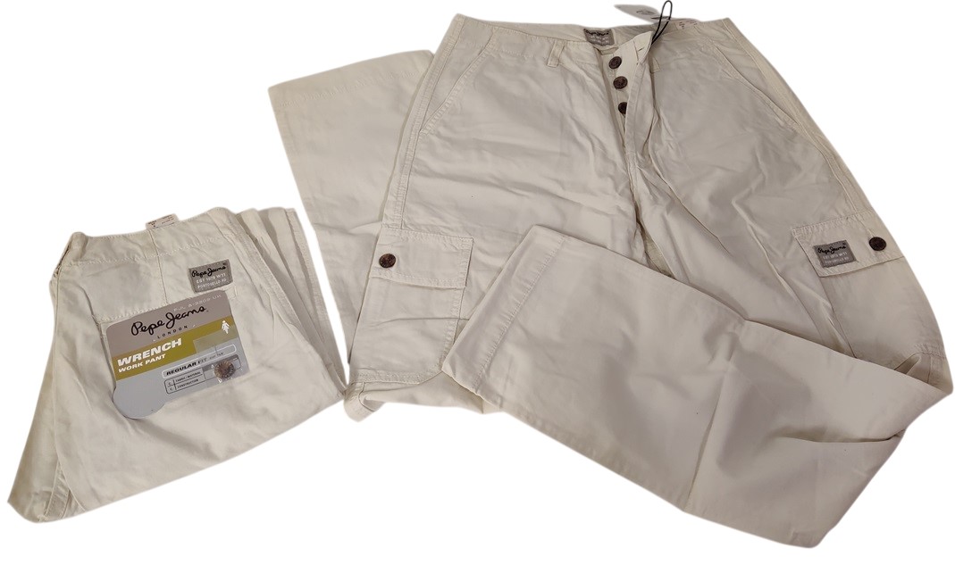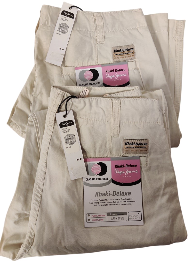 4 kpl Pepe Jeans kangashousuja; 2 kpl Khaki Deluxe ja 2 kpl Wrench Work pants, eri kokoja, kaikki ovat uusia ja käyttämättömiä, varastoinnista on saattanut tulla jotain pinttymää tms