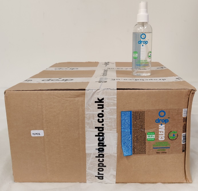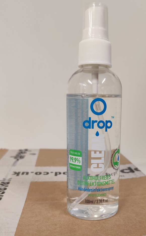 Pahvilaatikollinen, 70 kpl, 100 ml suihkepulloja alkoholiton käsidesi O drop Clean, huom. Päivys 2.4.2022