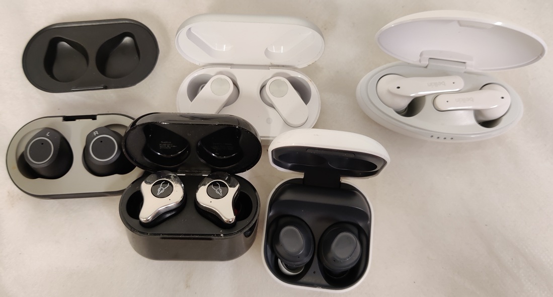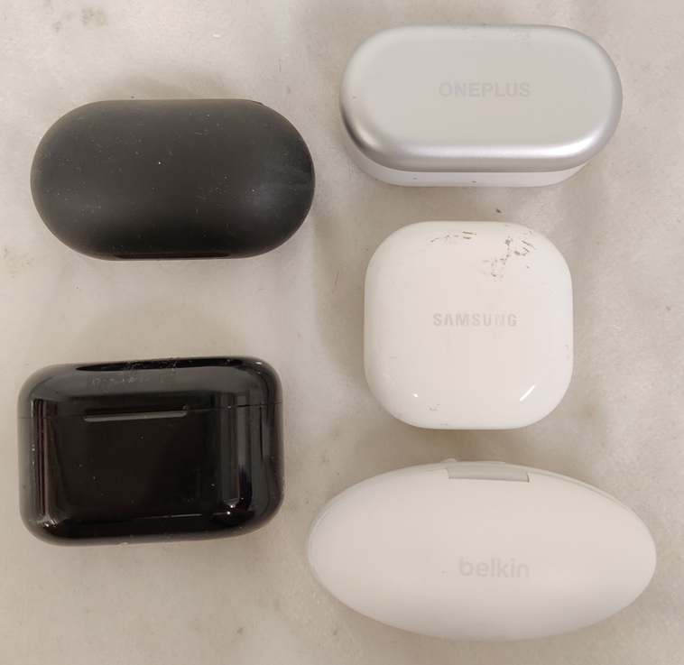 5 kpl erilaisia nappikuulokkeita, mm. Samsung, OnePlus, Belkin, Sabbat, kaikki testattuja ja toimivia