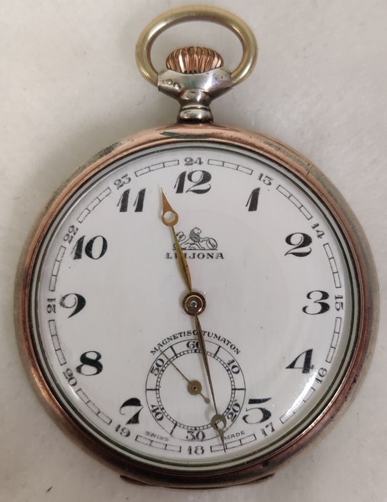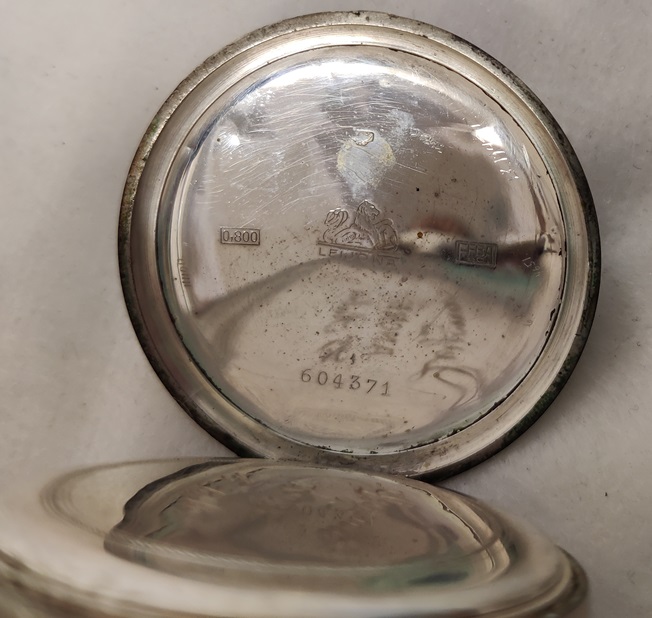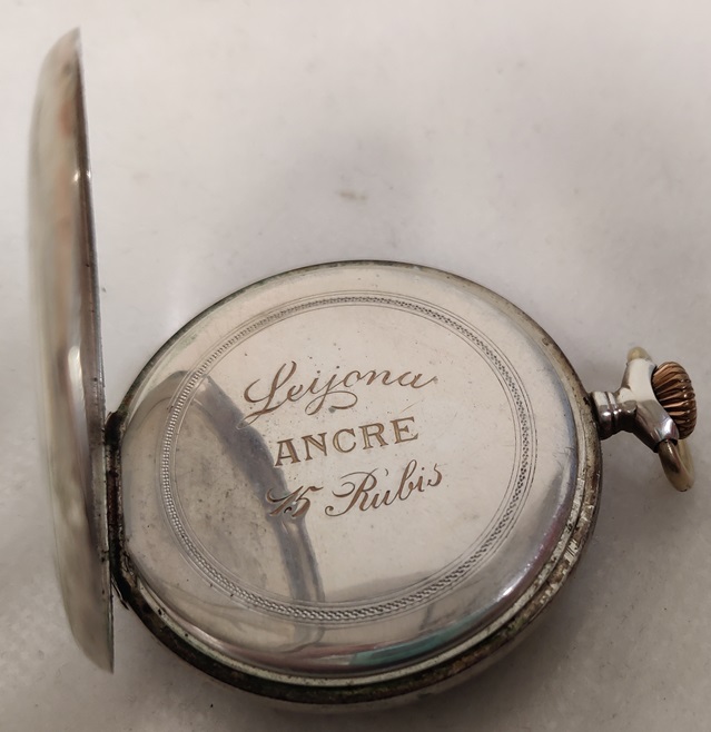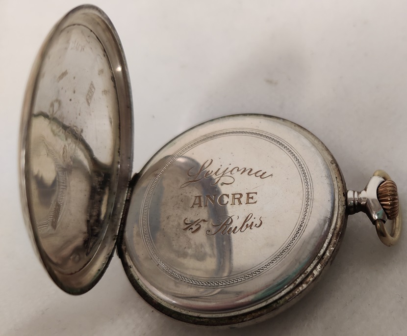 Hopeinen Leijona taskukello, Ancre 15 Rubis, hopean leima takakannessa 0,800, takakansi aukeaa, etukantta ei avattu, listaushetkellä toimii hyvin, vedettävä