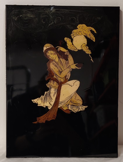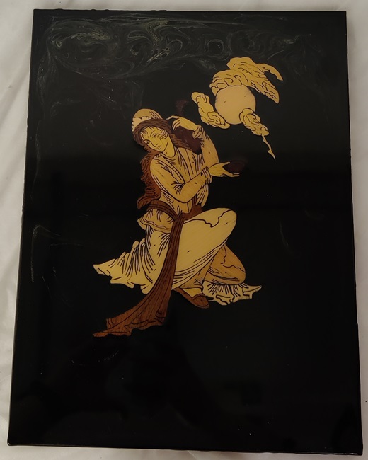 Polyesterilakkataulu. Taulun kuvio on ensin piirretty, jonka jälkeen suunnitelman vaatimat osat leikataan halutuista puulajeista ja liimataan taustavaneriin. Kuvioinnin päälle kaadetaan paksu kerros värjättyä polyesterilakkaa. Väri voi olla mustaa, punaista tai sinistä. Lakan kuivumisen jälkeen taulua hiotaan niin, että kuviointi ja puulajien värit tulevat näkyviin, tämän jälkeen taulu vielä lakataan värittömällä lakalla, hiotaan ja kiillotetaan. Lopputuloksena hienoa uniikkeja tauluja! Taulun koko leveys n. 30 cm ja korkeus 40 cm