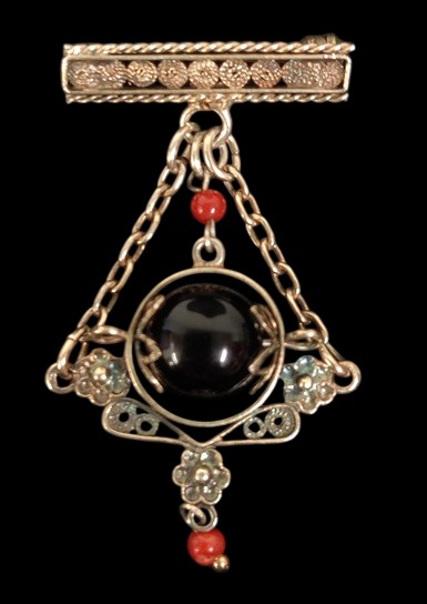 Hopeinen filigraanirintaneula, hopeaa, leima 800 filigraanirintaneula Sardiniasta, musta onyx ja korallia