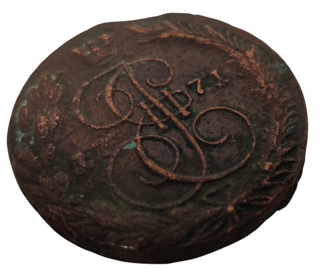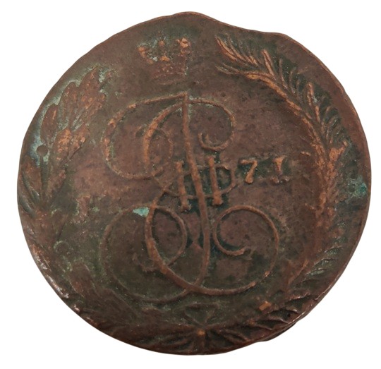 5 kopeekkaa vuodelta 1771 "Piparkakkuraha", Venäjältä keisakunnan ajalta, kunto tyydyttävä, Katarina Suuren hallitsija-ajalta