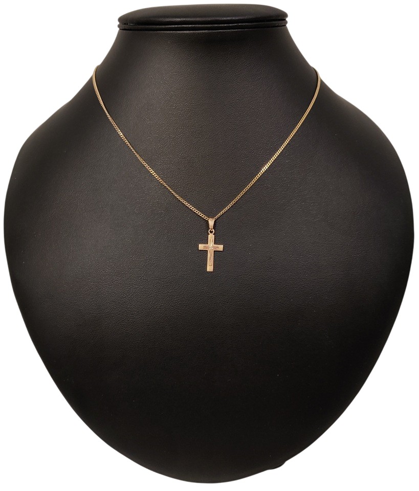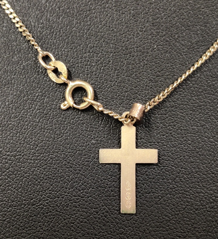 Kultainen risti kultaketjussa, kaikki 585, kullan sävyssä eroa, ketju ketaisempi ja risti punertavampi, ketjunpituus n. 45 cm, riipuksen pituus riipuleinkkeineen n. 2,5 cm, kokonaispaino n. 4,5 gr, risti kaivertamaton, Saurum, kruunu ja L9