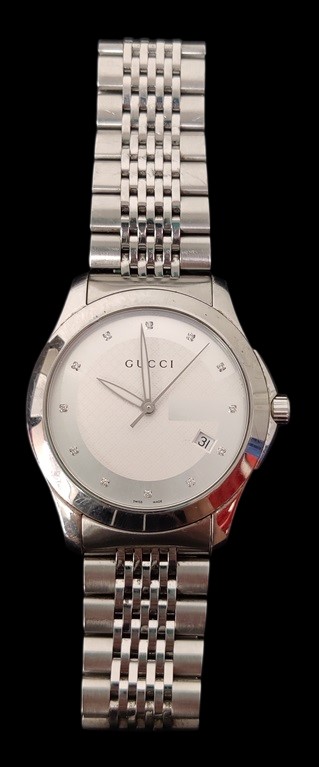 Gucci kello, aito! Gucci G Timeless Diamonds Silver Dial Silver Steel Strap Watch For Men - YA126404, 12 timanttia, halkaisija 38 mm, alkuperäinen kuitti mukana, lisätietoa: https://watch-connection.com/products/gucci-g-timeless-diamonds-silver-dial-silver-steel-strap-watch-for-men-ya126404?_pos=1&_sid=d108ebc35&_ss=r
