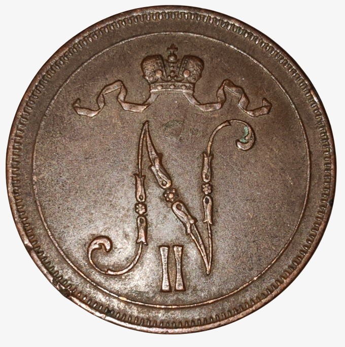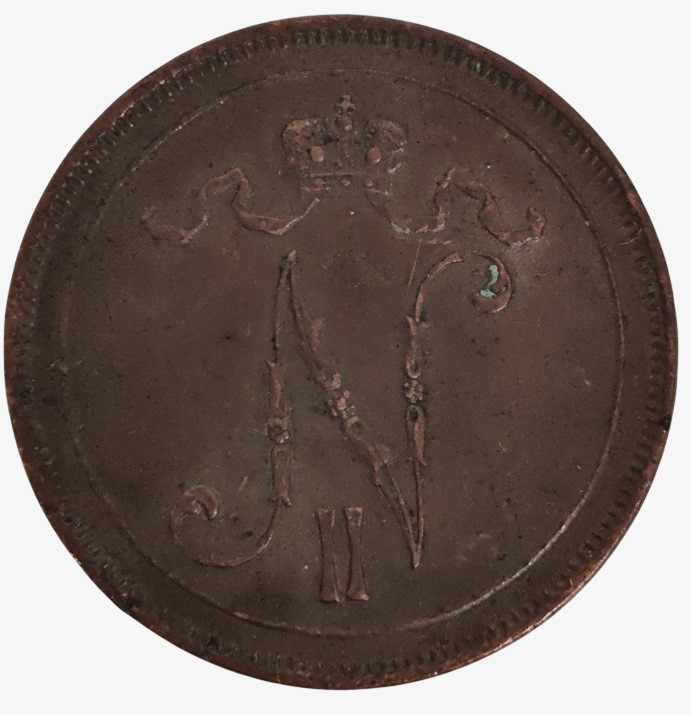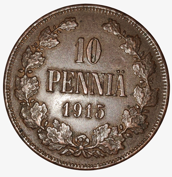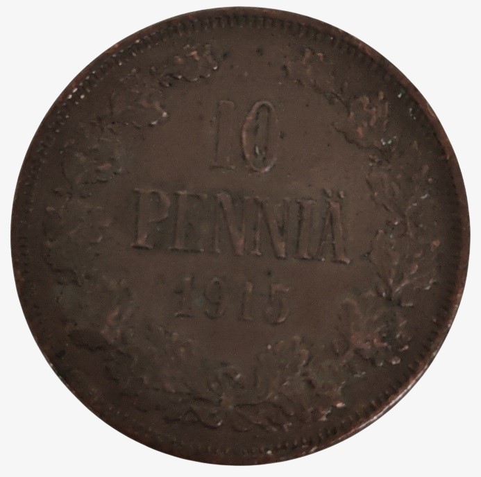 10 pennin kuparikolikko Suomen suuriruhtinaskunnan ajalta, vuodelta 1915, Nikolai II monogrammi