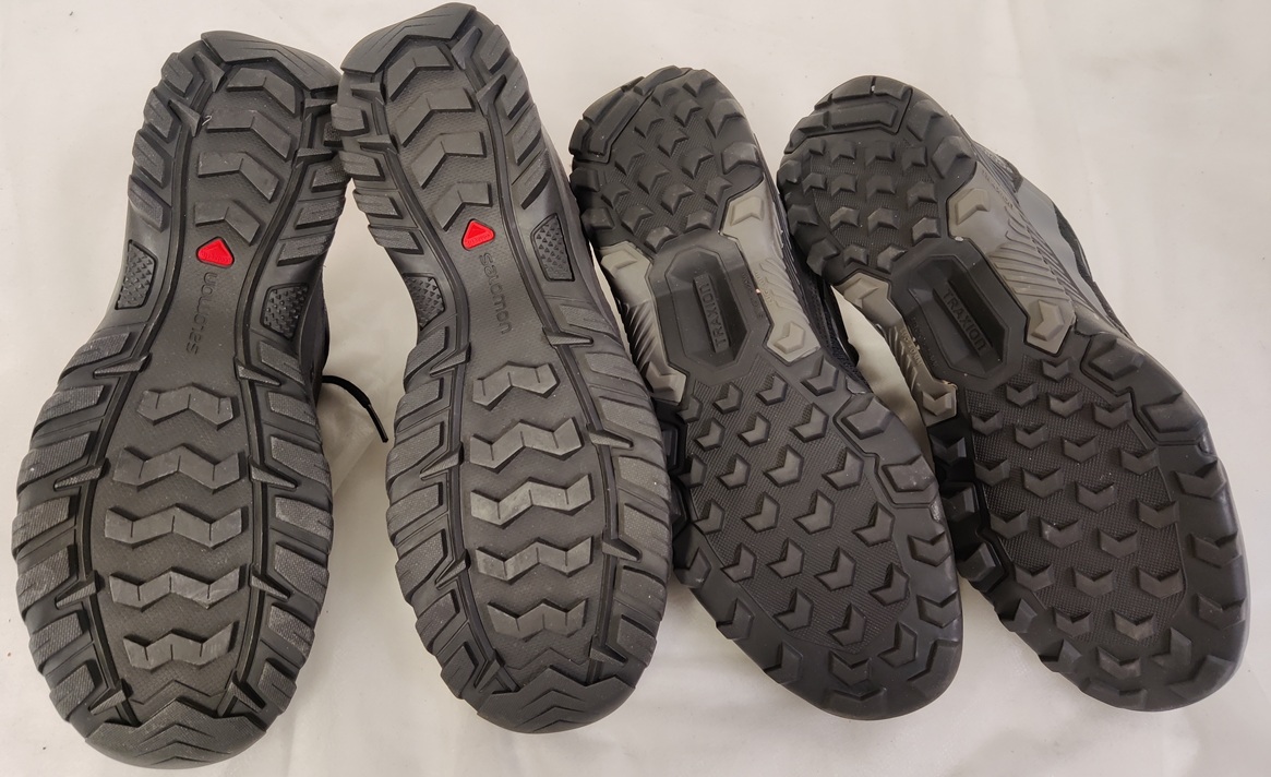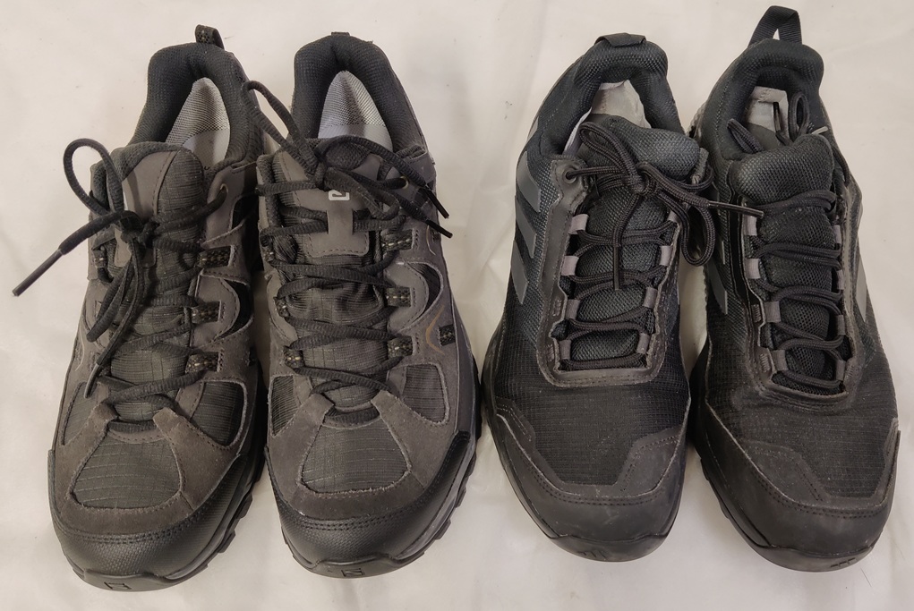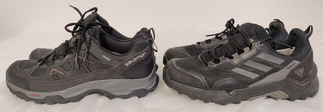 2 paria ulkoilukenkiä: Salomon Fortaleza Goretex vaelluskengät, uudenveroiset, koko 45 1/2 (11) ja Adidas Terrex maastojuoksukengät, melkein kuin uudet, koko 43 1/3 (9)
