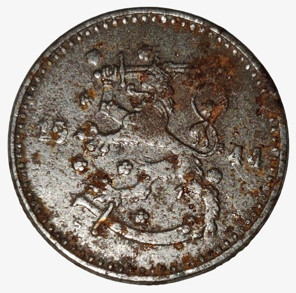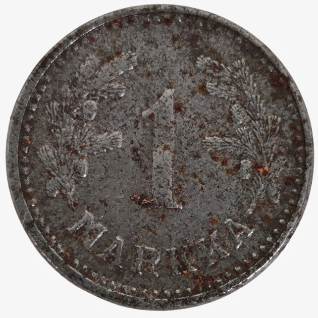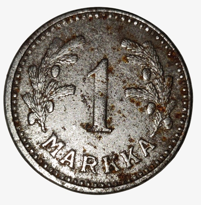 Suomalainen 1 markan kolikko vuodelta 1941, pinnalla mahdollisesti ruostetta tms..