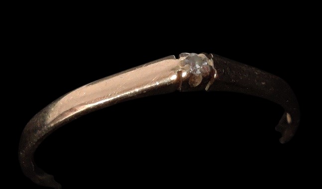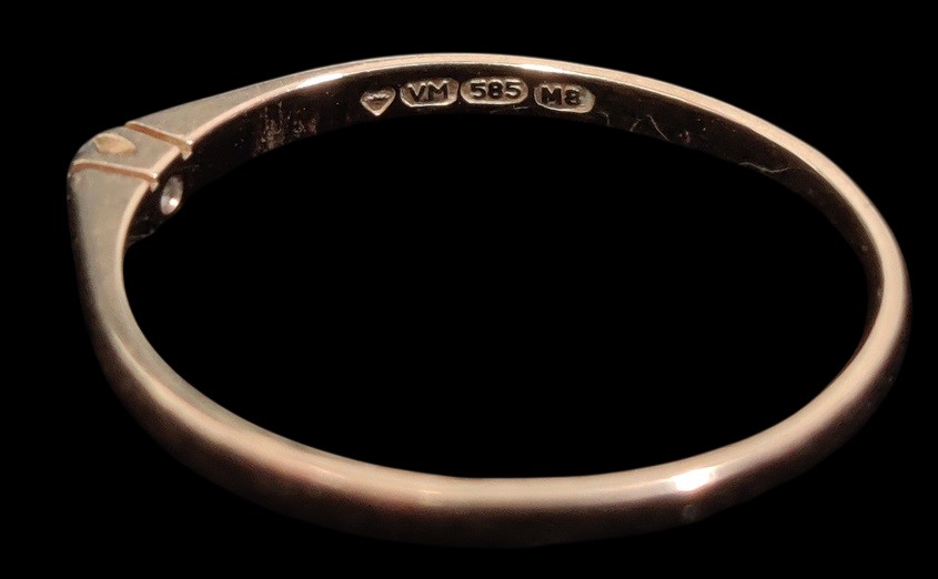 Ohut kultainen timanttisormus, yksi pienen pieni timantti, kruunu, VM, 585 ja M8 leimat, koko n 18,25, paino n. 1,14, kaivertamaton tai kaiverrukset hyvin kuluneet