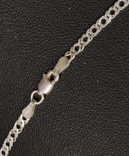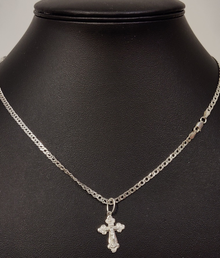 Hopeinen ristiriipus ja hopeinen ketju, ketju litteä, kaikissa hopea leima 925, ketjun pituus 45 cm, käyttövalmis koru sellaisenaan, ristin takana kyrillisillä kirjaimilla teksti