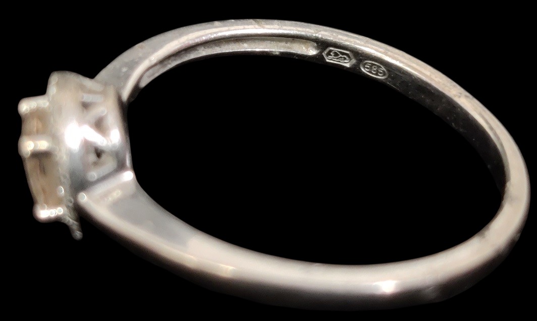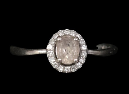 Valkokultainen 585 morganiitti-timanttisormus, haloistutuksessa 18 pientä timanttia ja keskellä morganiitti, koko noin 17,5, kokonaispaino noin 2,3 gr, kaivertamaton