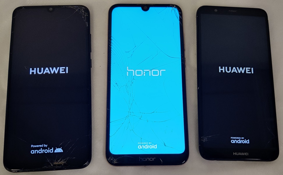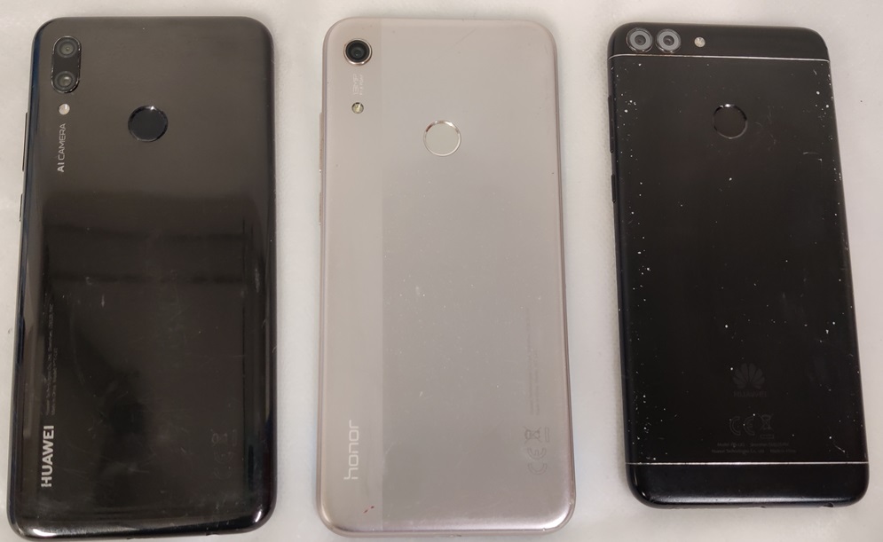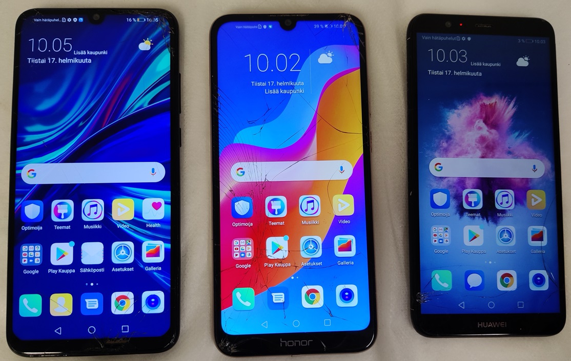 Huawei P Smart, 32 Gt, FIG-LX1, Huawei P Smart 2019, 64 Gt, POT-LX1, Honor 8 A, 32Gt, JAT-L29, kaikissa puhelimissa etulasit enemmän tai vähemmän säröillä ja halkeamilla, takaosat ehjät/kuluneet, kaikki testattuja jatoimivia