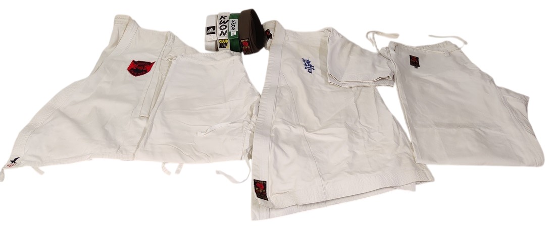 2 karatepukua, koot 175 ja 50, 4 vyötä: 2 valkoista, 1 vihreä ja 1 ruskea, pestäviä asuja, isoja kellertäviä tahroja / pinttymää, ehjiä