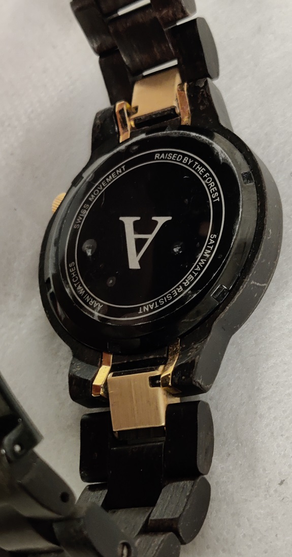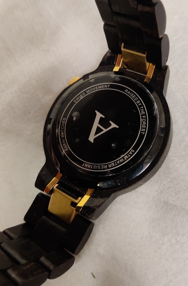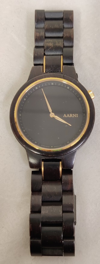 Tyylikäs tumma Aarni XO Eeben rannekello, lasi naarmuton, puinen ranneke hyvässä kunnossa, patteri vaihdettava, ei käyntitestattu, takakannessa vielä suojakalvo paikallaan, kapeaan ranteeseen säädetty