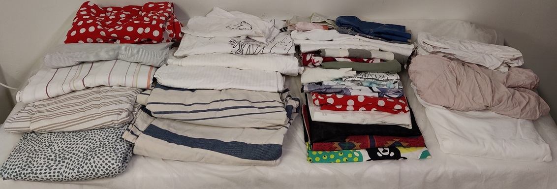 2 urheilukassillista lakanoita, tyynyliinoja ja pussilakanoita