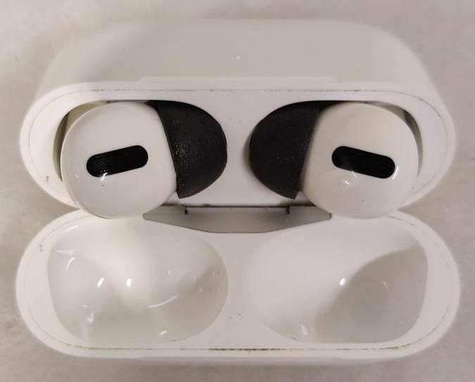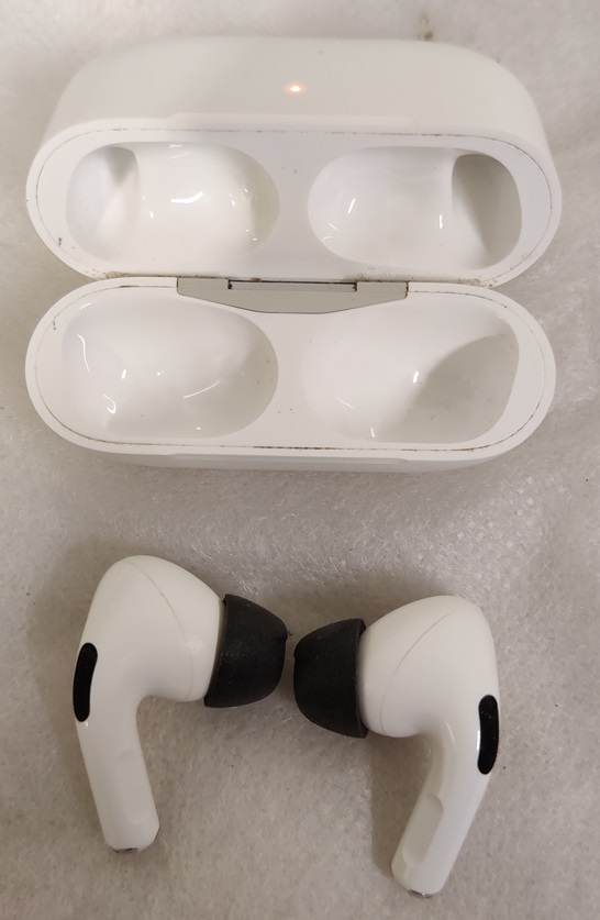 Apple Airpods Pro, gen 1, A2190, latauskotelo ja kuulokkeet, kuulokkeissa vaihdettu mustat korvatulppien pehmusteet, testattu ja toimivat