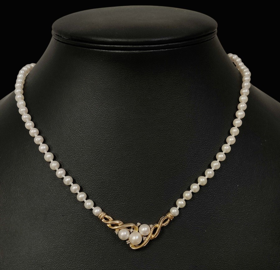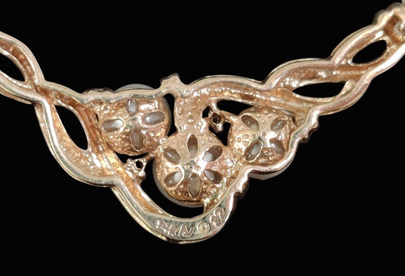 Aidot helmet, helmien halkaisija n. 5 mm, keskellä on kullattu riipus, 14 K, leveys 4 cm, riipuksessa helmiä ja kirkkaita kiviä, ketjun pituus n 41 cm
