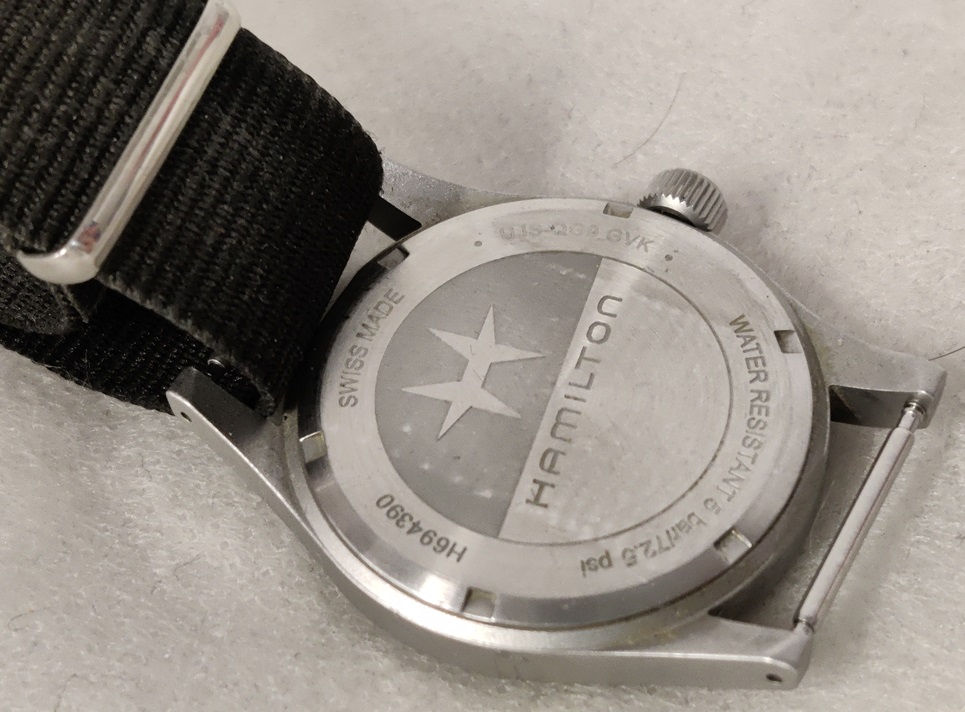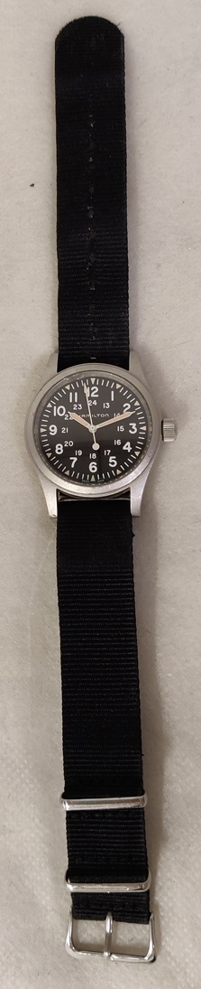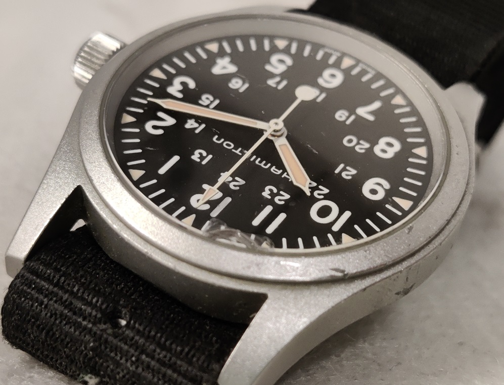 Hamilton Khaki Field rannekello, H694390, musta tekstiiliranneke, kellotaulun lasissa pientä osumaa
