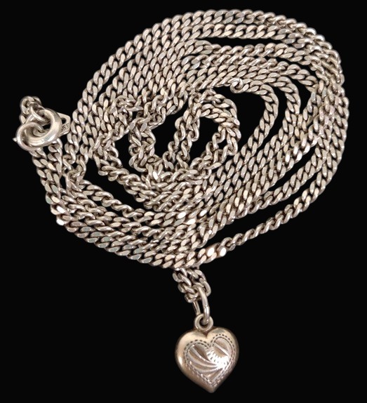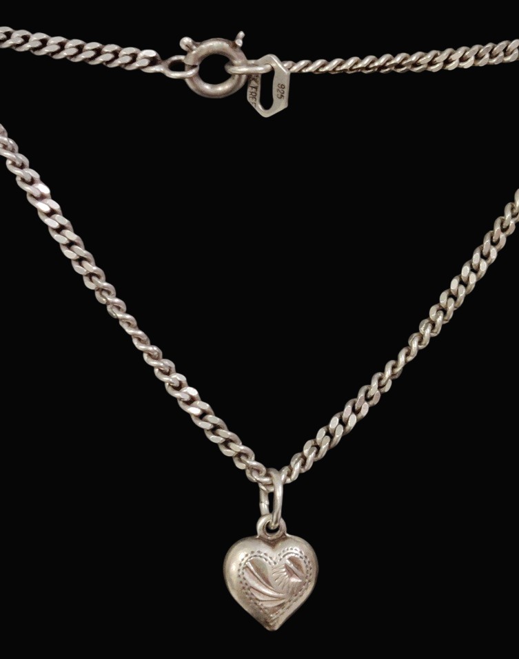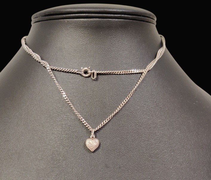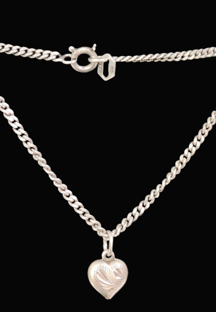 Hopeinen 925 leimalla pitkä 71 cm ketju, pienen pieni sydänriipus, jonka leima vanhaa eurooppalaista kantaa 835S