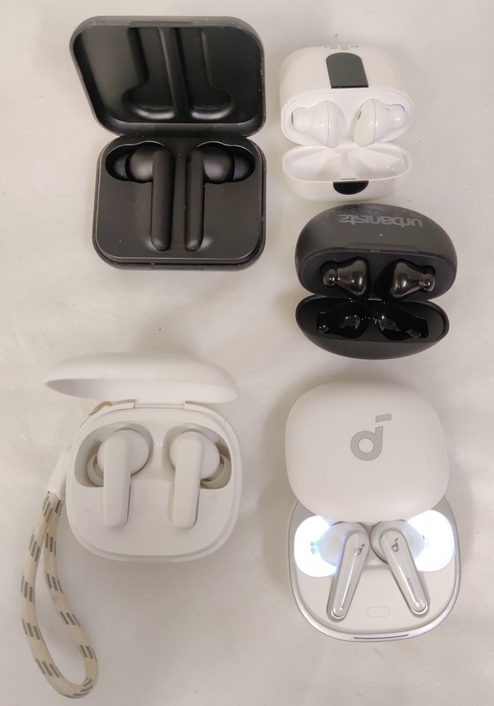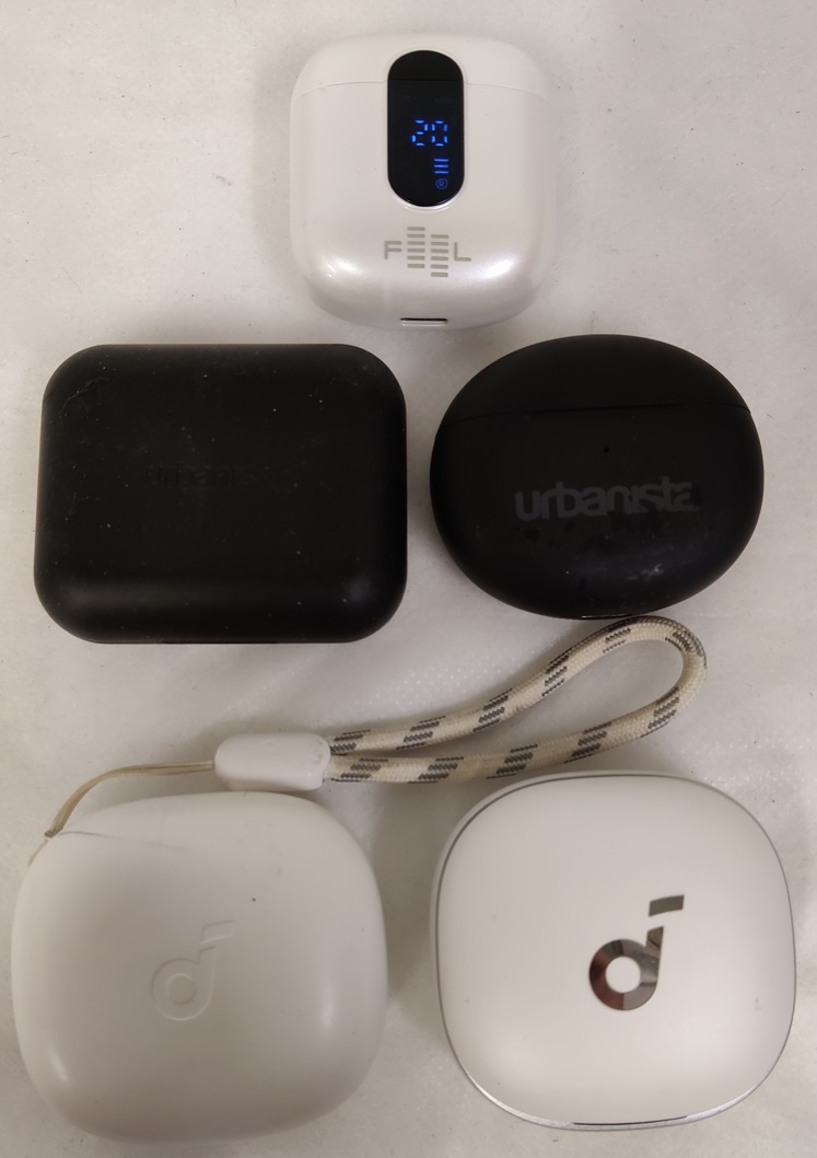 5 kpl sekalaisia nappikuulokkeita; Soundcore, Urbanista ja Feel, kaikki testattuja ja toimivia