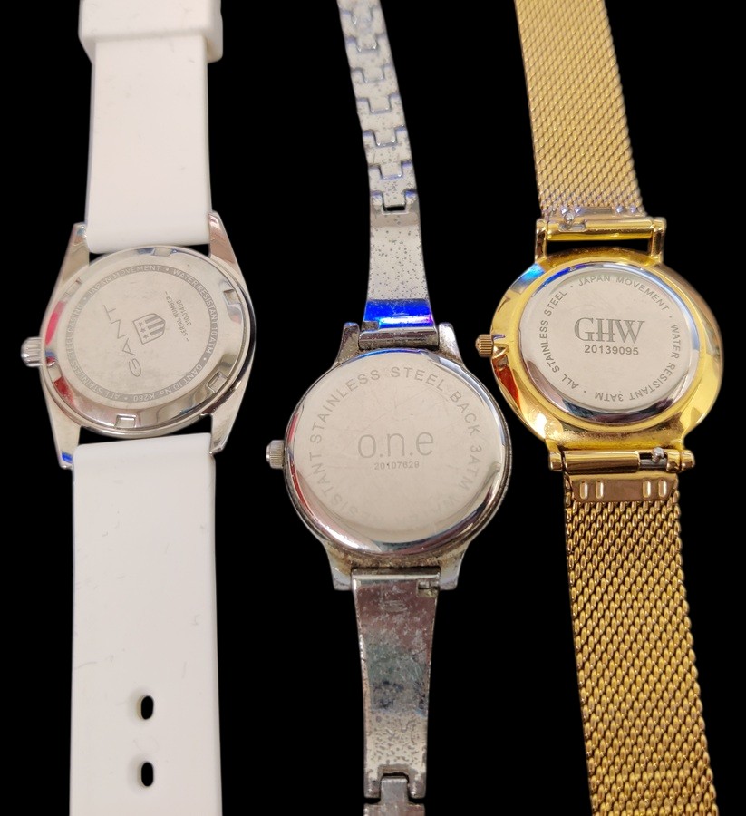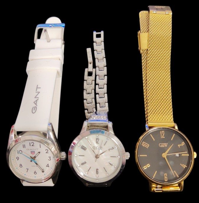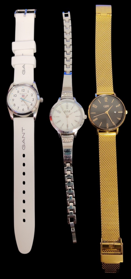 3 kpl tyylikkäitä kelloja; Gant , GHW ja O.N.E, kaikki toimivia, ehjiä, pinetä käyttökulumaa on, kellotaulujen halkaisijat n. 27-31 mm