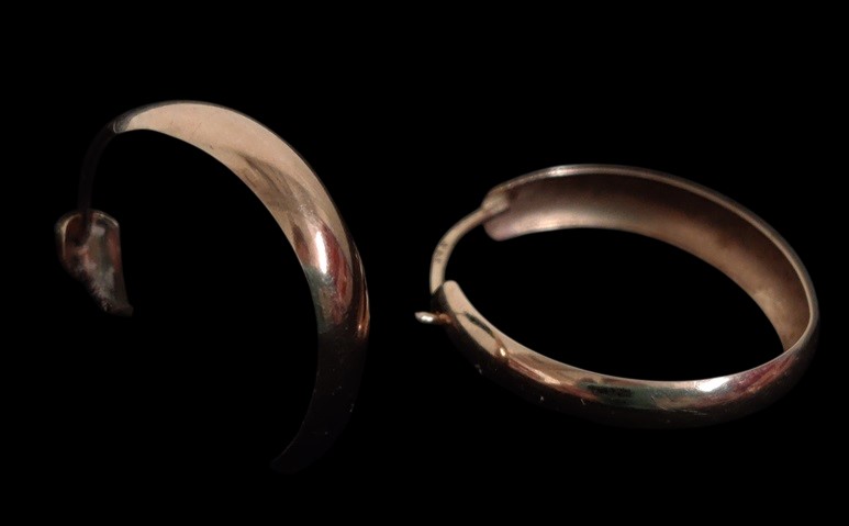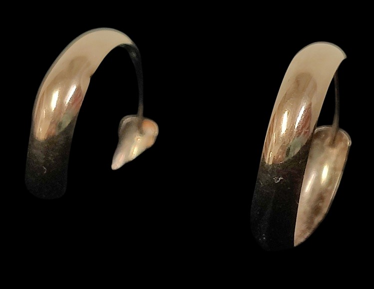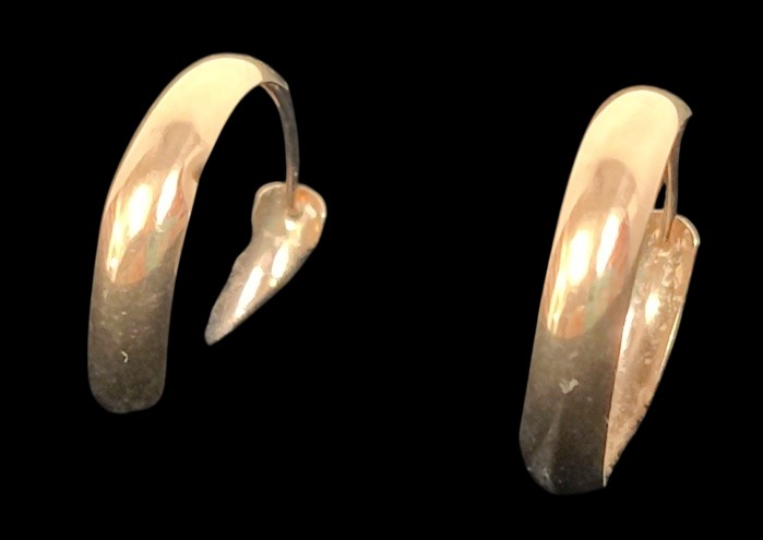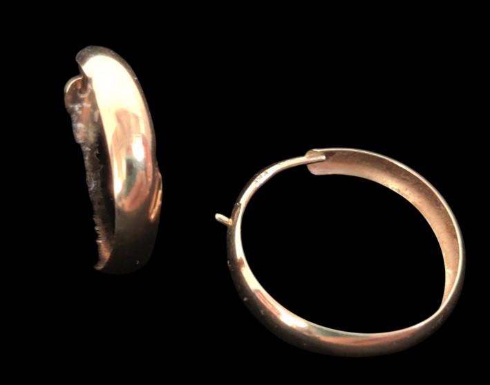 Kultaiset korvarenkaat, 585 leimalla, halkaisija noin 15,6 mm, leveys n. 3mm, paino yhteensä n. 0,53 gr
