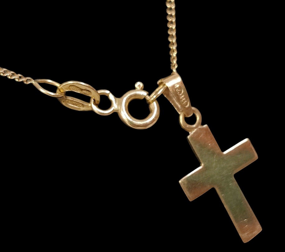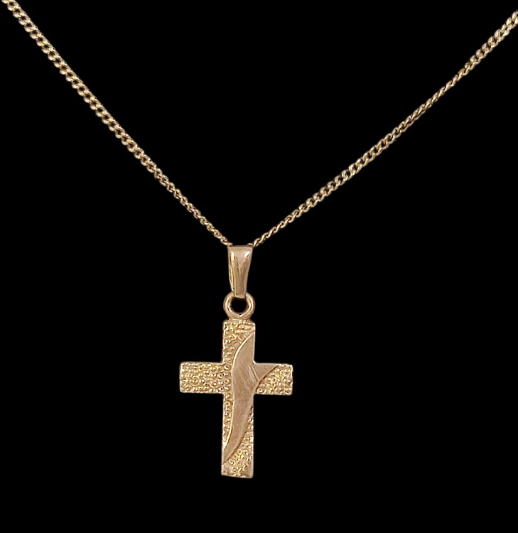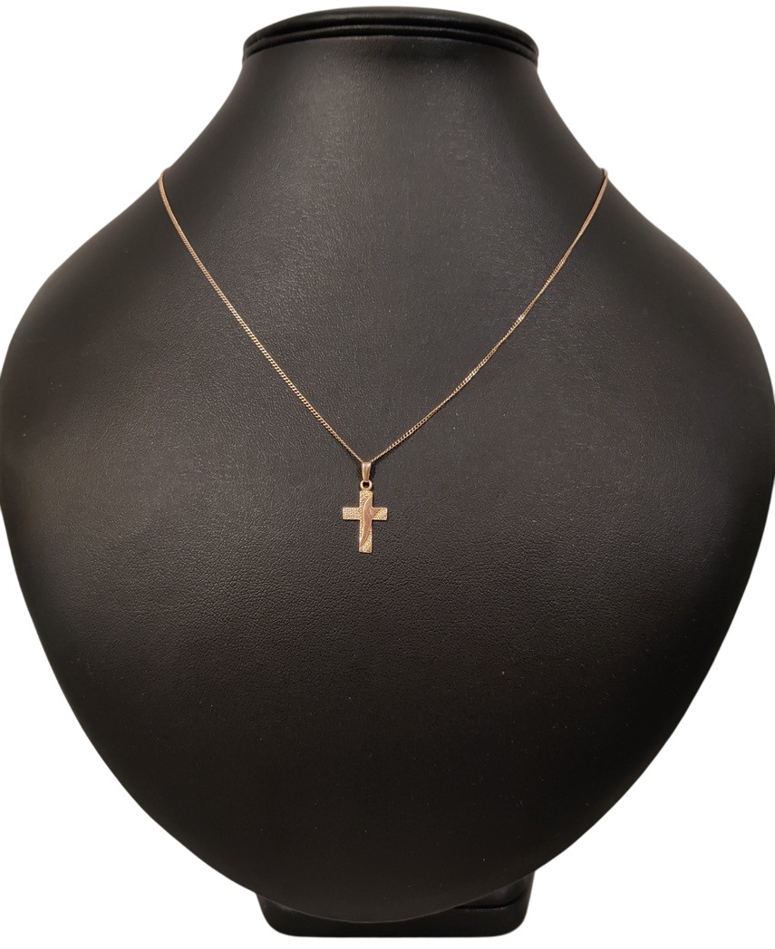 Kultainen risti ja ohut ketju, kaikissa leima 585, Ketjun pituus lukkoineen 48 cm, ristin korkeus riipuslenkkeineen n. 2cm, kokonaispaino n. 2,1 gr, risti kaivertamaton
