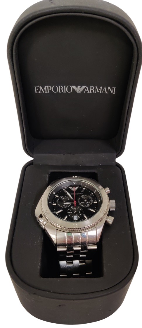 Miesten Emporio Armani, AR-0546, lasi siisti ja ehjä, naarmuton, teräsreunoilla käyttökulumaa, halkaisija 43 mm, säilytyskotelo mukana