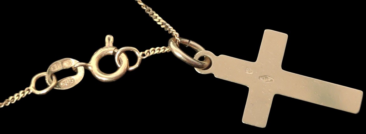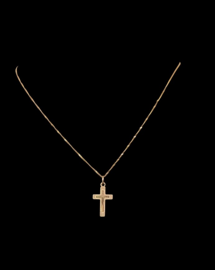 Kultainen ohut ketju, 585, pituus n. 48 cm, ristiriipus, 585, leveys n. 1 cm, korkeus n. 2 cm, kaivertamaton, yhteispaino n. 1,94 gr