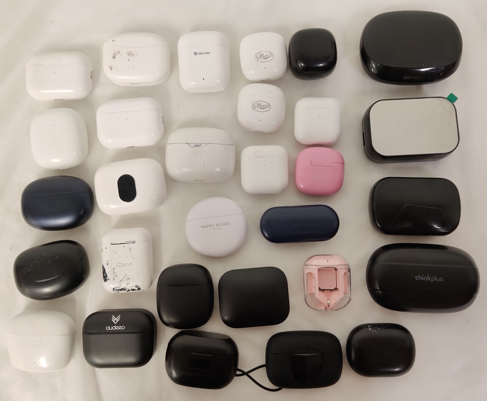 30 kpl tyhjiä kuulokekoteloita, eri merkkejä, mm. JBL, defunk, Denver, Redmiei testattuja