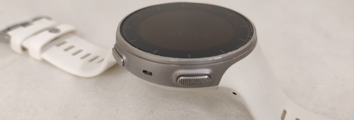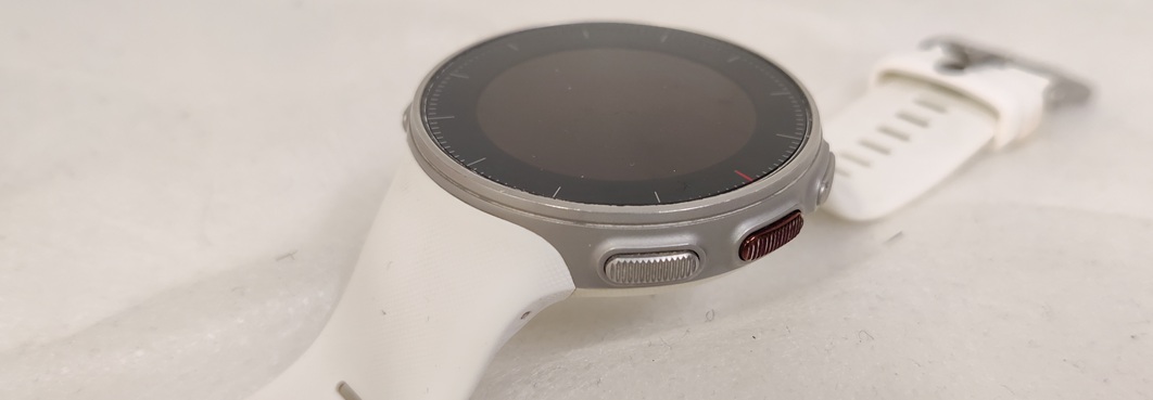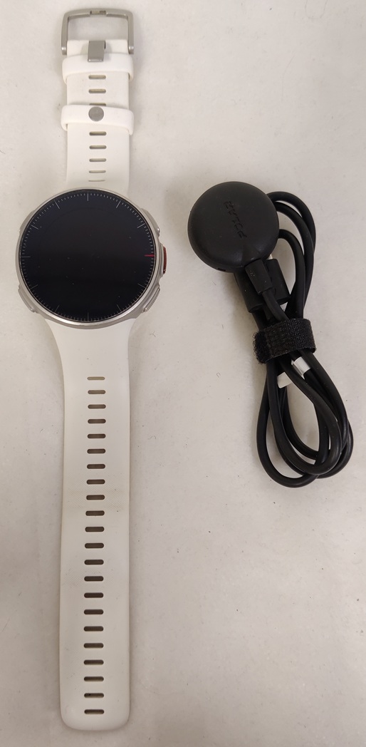 Polar Vantage V urheilukello, näytössä ja kellossa on vähän käyttökulumaa. Oikeanpuoleiset näppäimet ovat jäykkiä ja niitä täytyy painaa kunnolla että toimivat, muutoin testattu ja toimiva, laturi mukana
