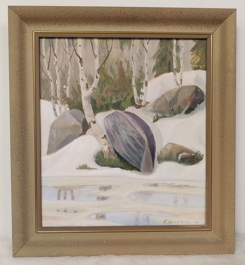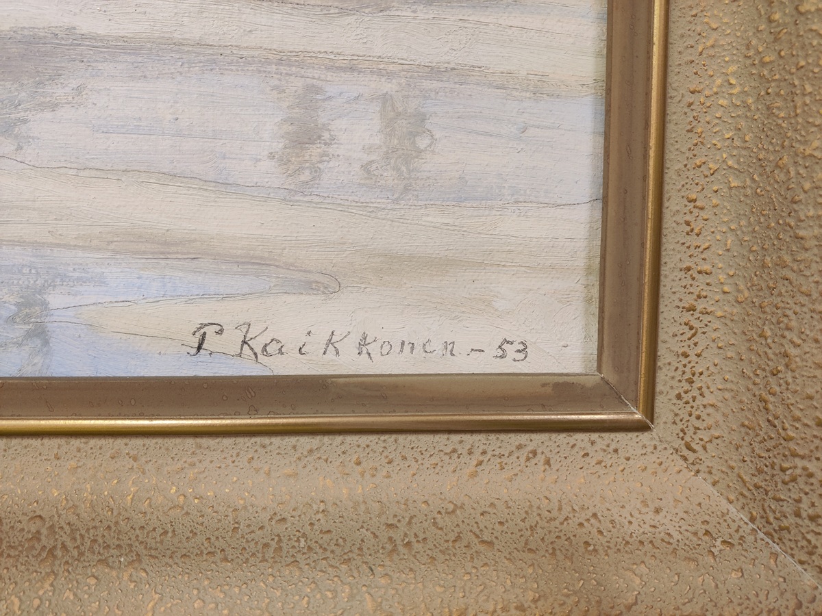 Taulu, öljy kankaalle, Paavo Kaikkonen, signeerattu P. Kaikkonen -53, tunnettu taidemaalari, jonka erikoisuus oli talviaiheet, iänmukaista kevyttä kulumaa, mutta erinomaisessa kunnossa! Korkeus 75 cm, leveys 68 cm